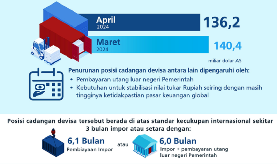 JAKARTA | SAH – Cadangan devisa Indonesia turun 0,3 miliar dolar AS dari sebelumnya 150,2 miliar dolar pada Agustus 2024 menjadi 149,9 miliar dolar AS pada akhir September 2024. Direktur Eksekutif Departemen Komunikasi Bank Indonesia, Ramdan Denny Prakoso, Senin, 7 Oktober 2024 merilis, penurunan cadangan devisa tersebut antara lain dipengaruhi oleh pembayaran utang luar negeri ...