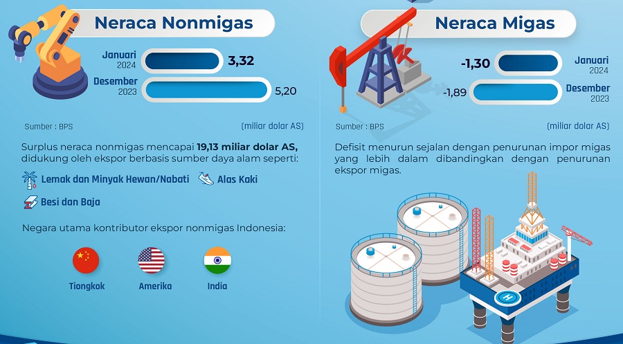 JAKARTA | SAH – Surplus neraca perdagangan Indonesia pada Mei 2024 tercatat sebesar 2,93 miliar dolar, hanya tumbuh 0,21 miliar dolar dari April 2024 yang surplus senilai 2,72 miliar dolar AS. Asisten Gubernur/Kepala Departeemen Komunikasi Bank Indonesia, Erwin Haryono melalui rilis No.26/124/DKom, Rabu 19 Juni 2024 menjelaskan, surplus neraca perdagangan Mei 2024 yang lebih tinggi ...