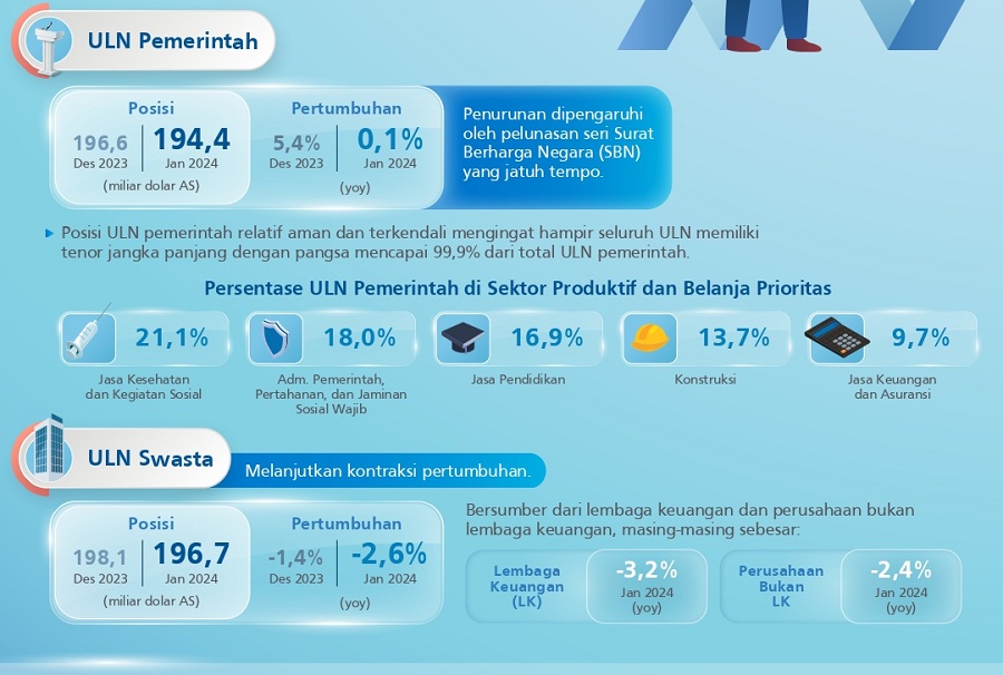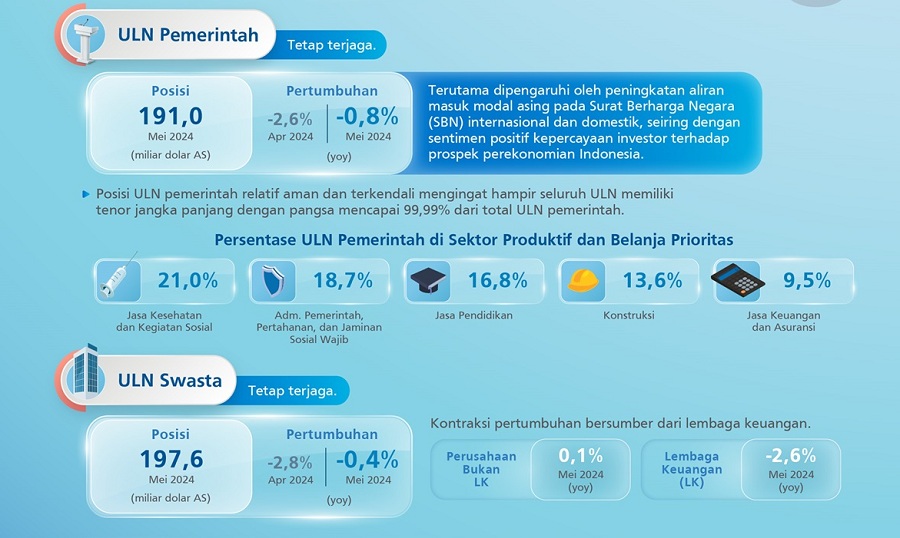 JAKARTA | SAH — Utang Luar Negeri (ULN) Indonesia pada Juli 2024 tercatat sebesar 414,3 miliar dolar AS, atau secara tahunan tumbuh sebesar 4,1%. Perkembangan ULN tersebut bersumber dari sektor publik, baik Pemerintah maupun Bank Sentral. Posisi ULN pada Juli 2024 juga dipengaruhi oleh faktor pelemahan mata uang dolar AS terhadap mayoritas mata uang global, ...